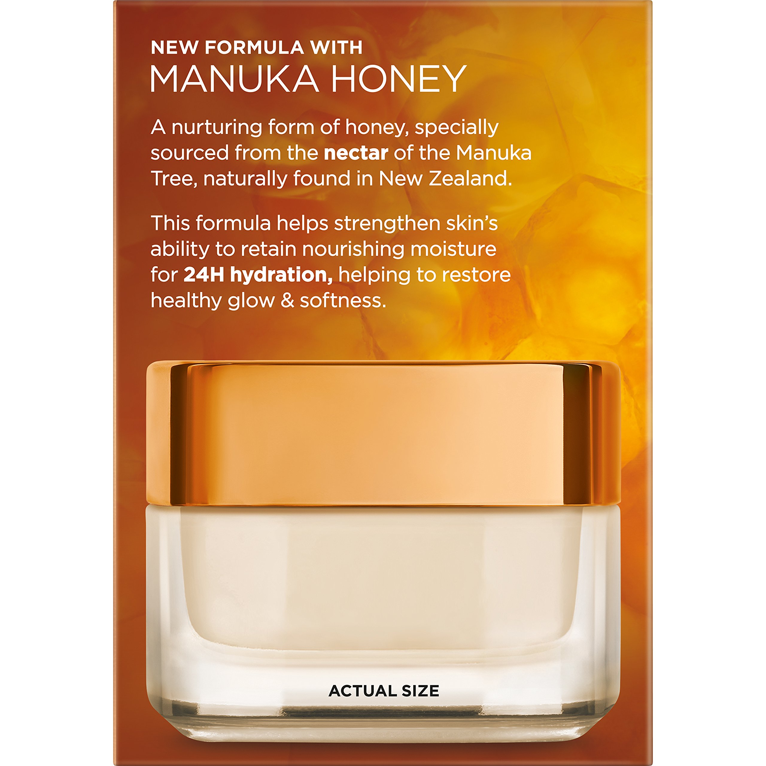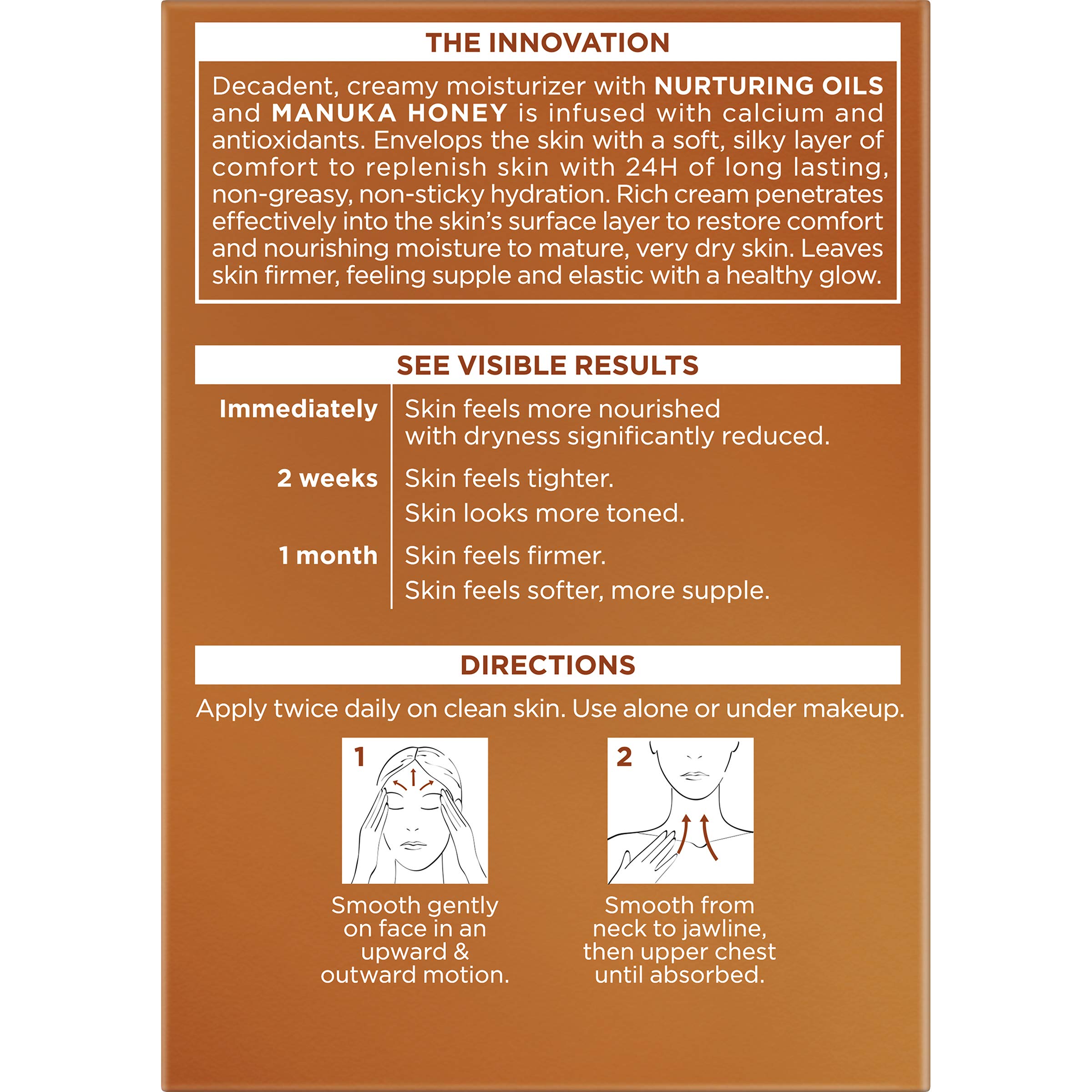 - Hydrating Day Cream: This creamy face moisturizer with nurturing oils and Manuka Honey Extract envelops the skin with a soft, silky layer of comfort to replenish skin with 24H of long lasting, non-greasy, non-sticky hydration